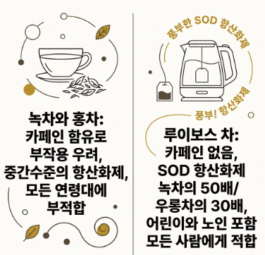 A. 녹차는 EGCG(에피갈로카테킨갈레이트) 함량이 높아 항산화 효과가 매우 강합니다. 루이보스차는 녹차보다 총 폴리페놀 함량은 낮지만, 카페인이 없고 독자적인 항산화 물질(아스팔라틴)을 함유해 카페인에 민감한 분이나 취침 전에 마시기에 유리합니다.